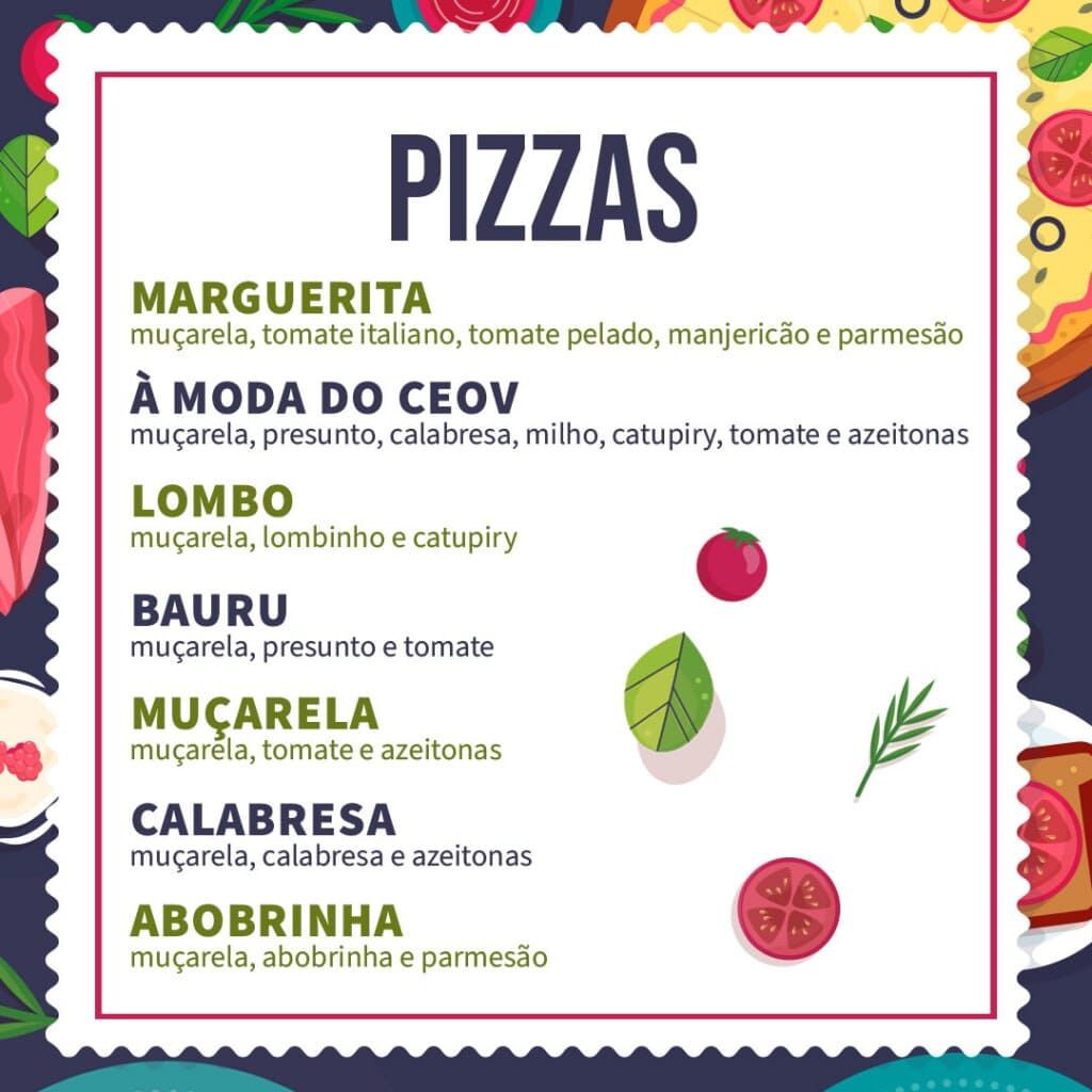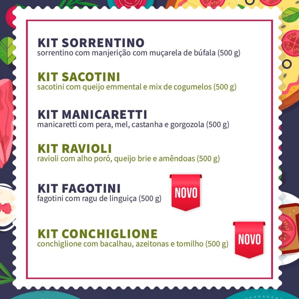 Massas:LasanhaCaneloneKit TorteiKit NhoqueKit Nhoque Recheado (novidade)Kit SorrentinoKit SacotiniKit ManicarettiKit RavioliKit Fagotini (novidade)Kit Conchiglione (novidade)Pizzas MargueritaÀ Moda do CEOVLomboBauruMussarelaCalabresaAbobrinha